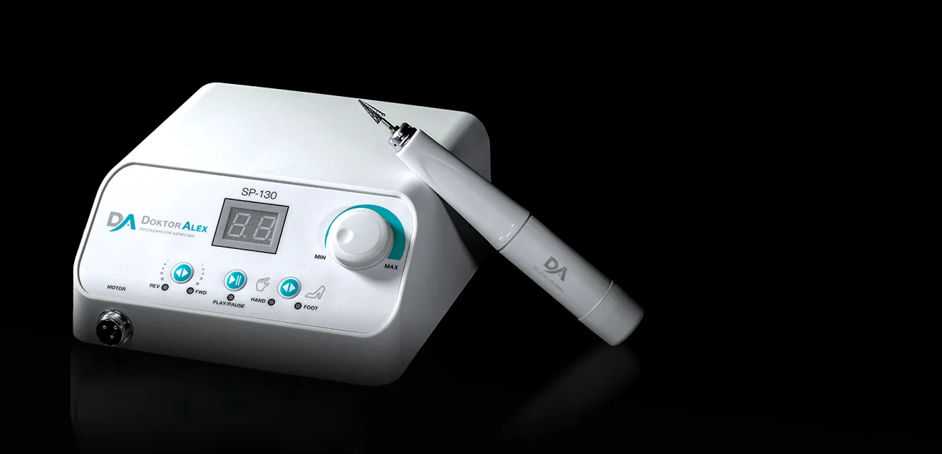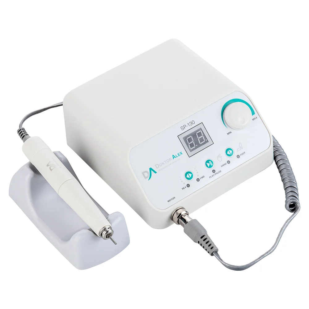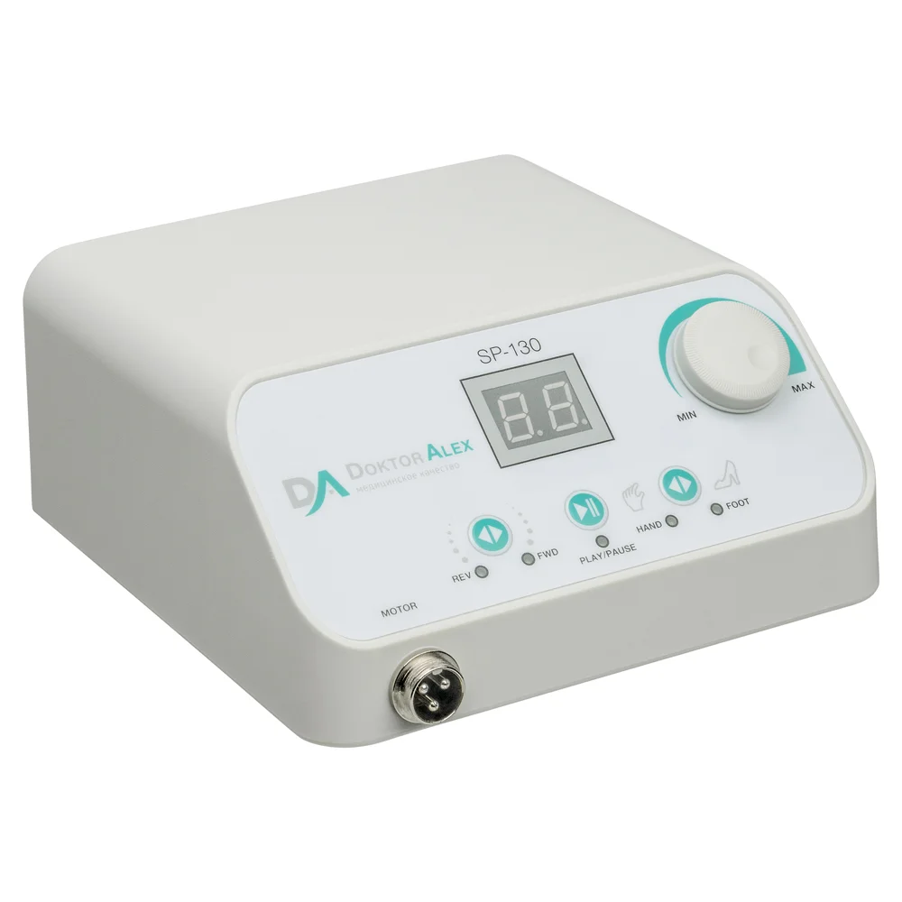 Dr Alex SP-130 — профессиональный аппарат для аппаратного маникюра и педикюра, рассчитанный на большой поток. Оснащён электронным дисплеем, системой диагностики и предупреждений о неисправности, режимом пуск/пауза, реверсом без снижения оборотов, а также регулировкой скорости педалью.