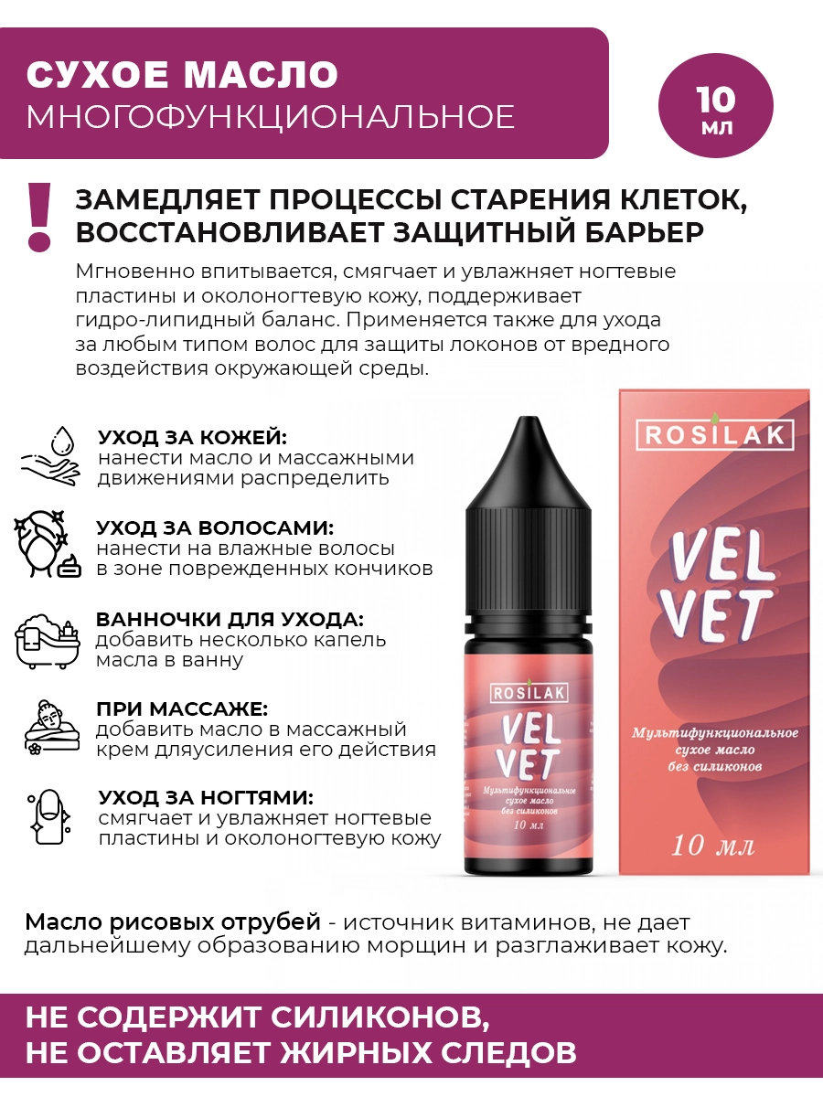 Многофункциональное сухое масло без силиконов VELVET бренда Rosilak в объеме 10 мл.
