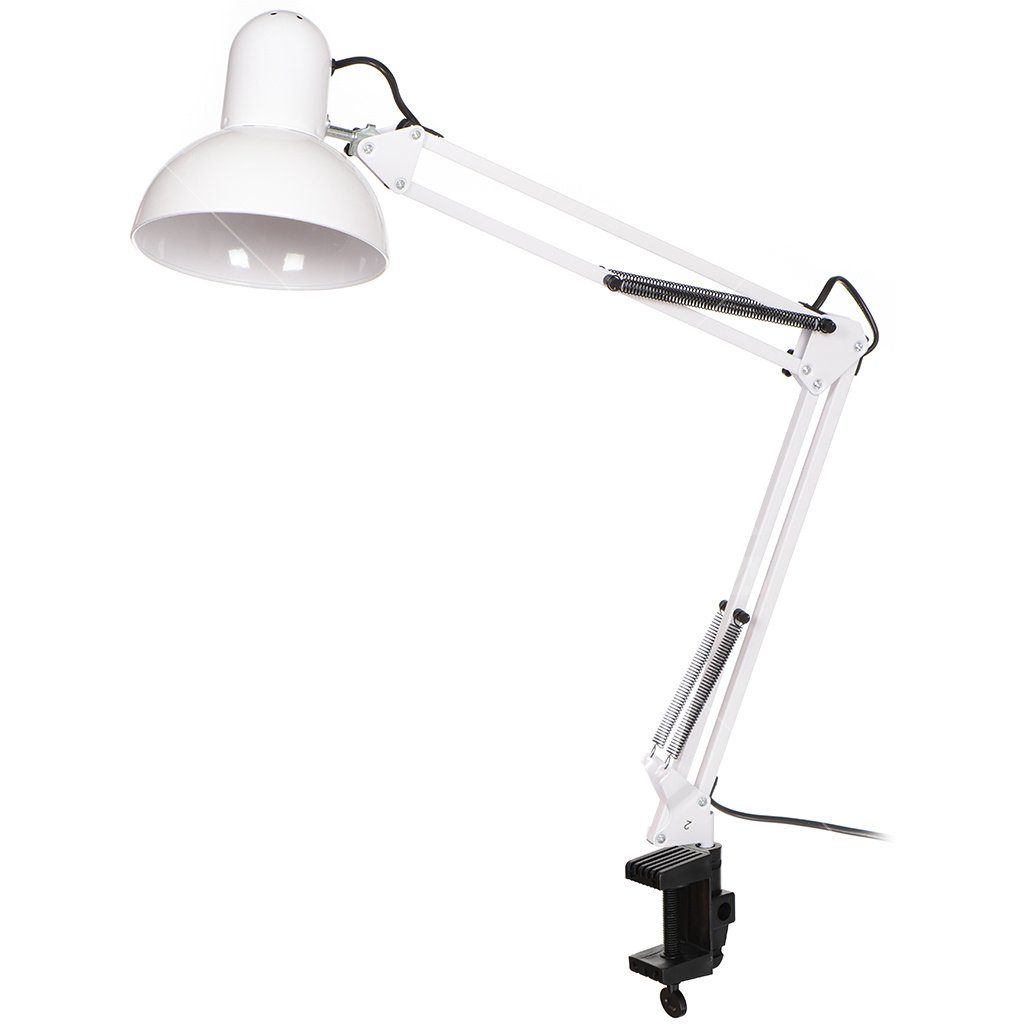 Лампа надежно крепится струбциной, не занимая подставкой дефицитного места на столе.