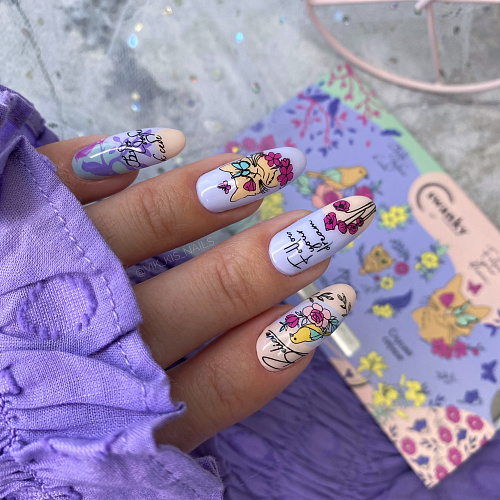 Нежная пластина весенне-летнего сезона, наполненная, как одиночными рисунками, так и паттернами цветов, птиц и надписей, имеющий тонкий, мечтающий характер. Дизайн прекрасно подойдет для техники реверсивного стемпинга. Все элементы можно разукрасить в любой цвет и украсить маникюр утонченной, романтичной натуры.